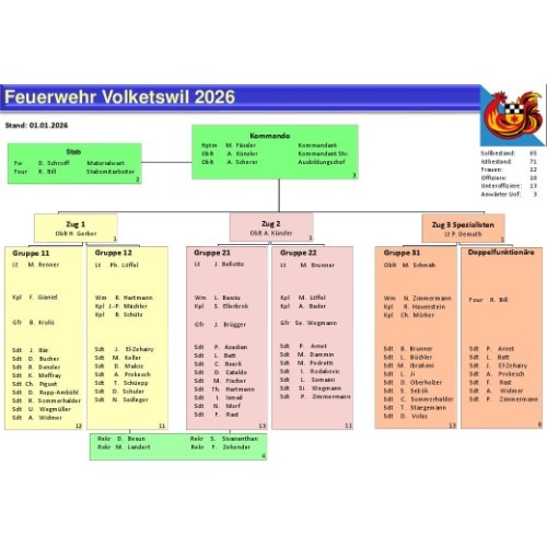 Die Feuerwehr Volketswil ist in 3 Züge gegliedert. Die Details dazu können dem Organigramm entnommen werden.